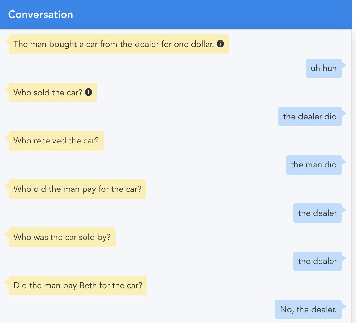 Notice that the context was entered into the conversation on the first line. There is no other background knowledge involved in this example—it is all ICG (current context).