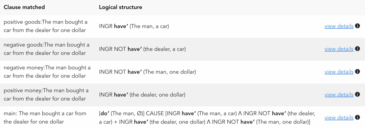 In the following example, the meaning of the language: “The man bought a car from the dealer for one dollar” involves a well specified transfer of goods.
